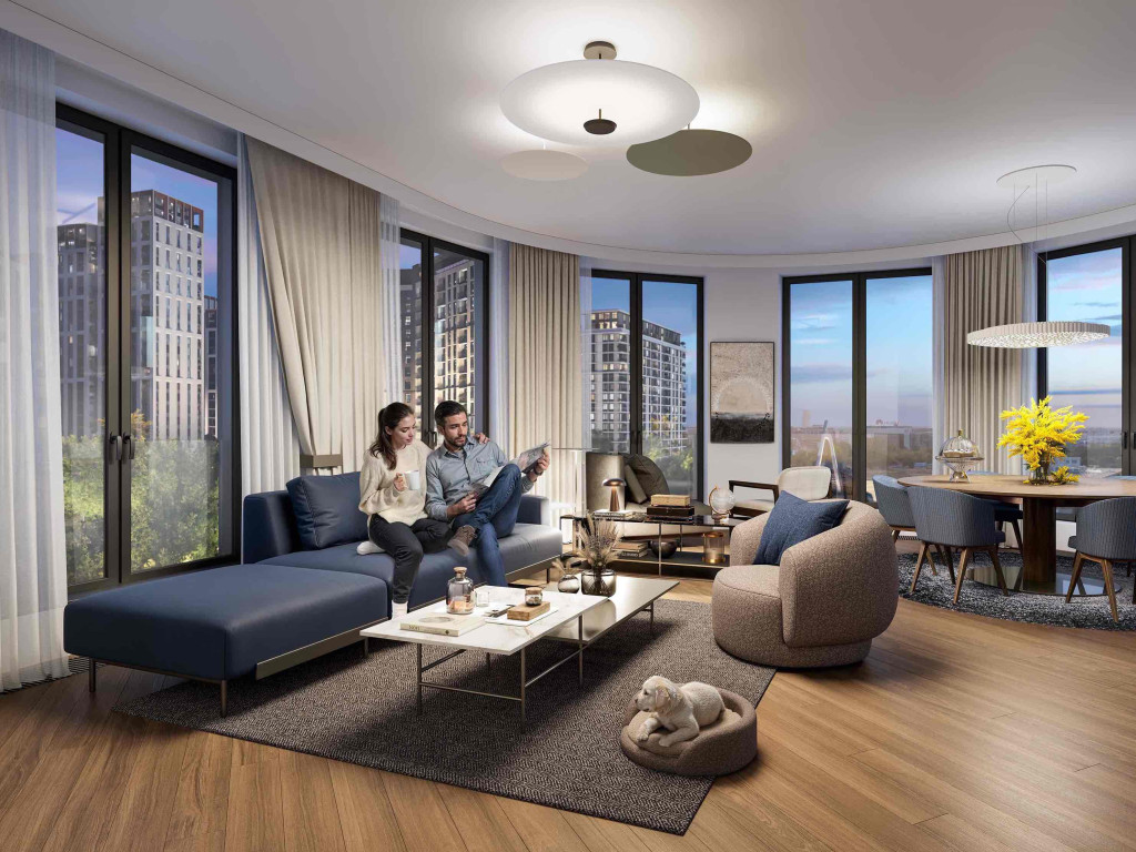 The building features 148 apartments of various types—from comfortable studios to luxurious duplex penthouses with four bedrooms. These spacious units are designed with large windows that allow plenty of natural light, offering beautiful views of the surrounding parks and the meticulously landscaped inner courtyard.