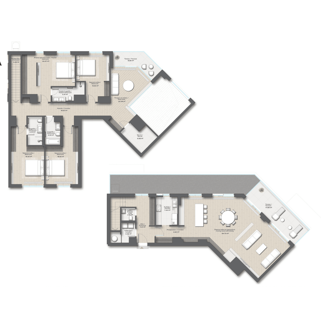 A four-bedroom duplex apartment in the BW Maestra building covers a total area of 267.56 m². It consists of four bedrooms, a living room with dining area, a rest area, a kitchen, three bathrooms, a powder room, a sauna, a laundry room, and two terraces.