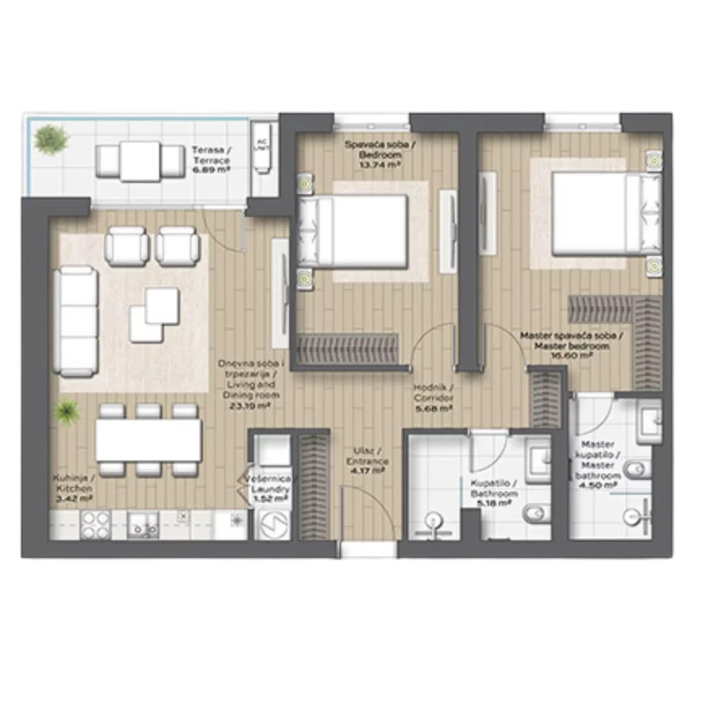 Trosoban stan u zgradi BW Sava zauzima ukupnu površinu od 84,89 m². Sastoji se od dve spavaće sobe, dnevne sobe i trpezarije, kuhinje, dva kupatila, vešernice i terase.